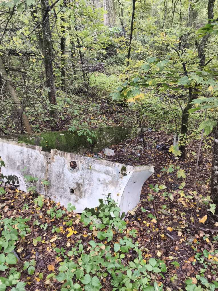 mežā mētājas kutera vraks, kur krājas atkritumu kalni