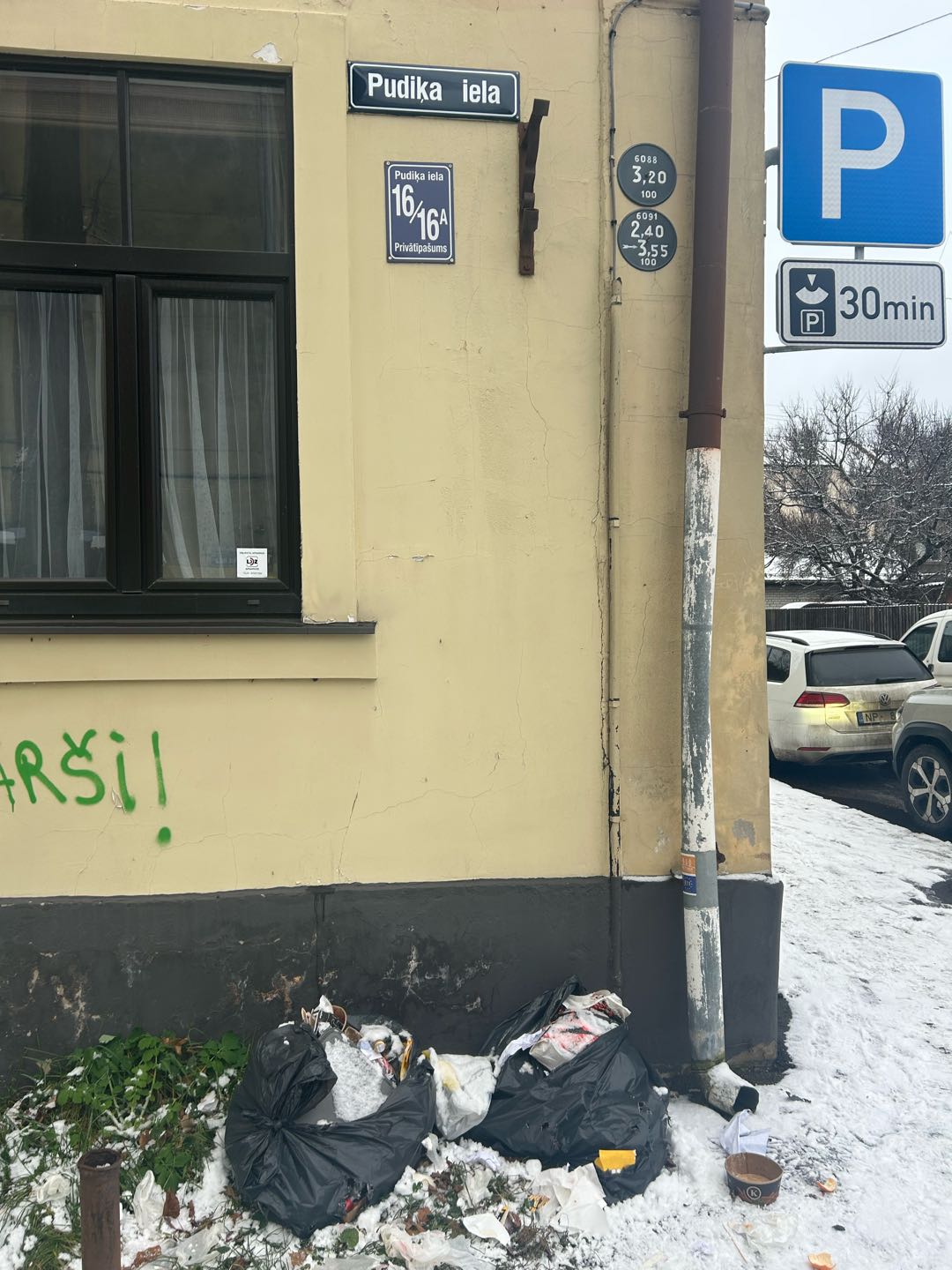 Pudiķa, Aizkraukles ielas krustojums. Atkritumi jau mētājās vairākas dienas. Uz priekšu arī ir vēl divi maisi.