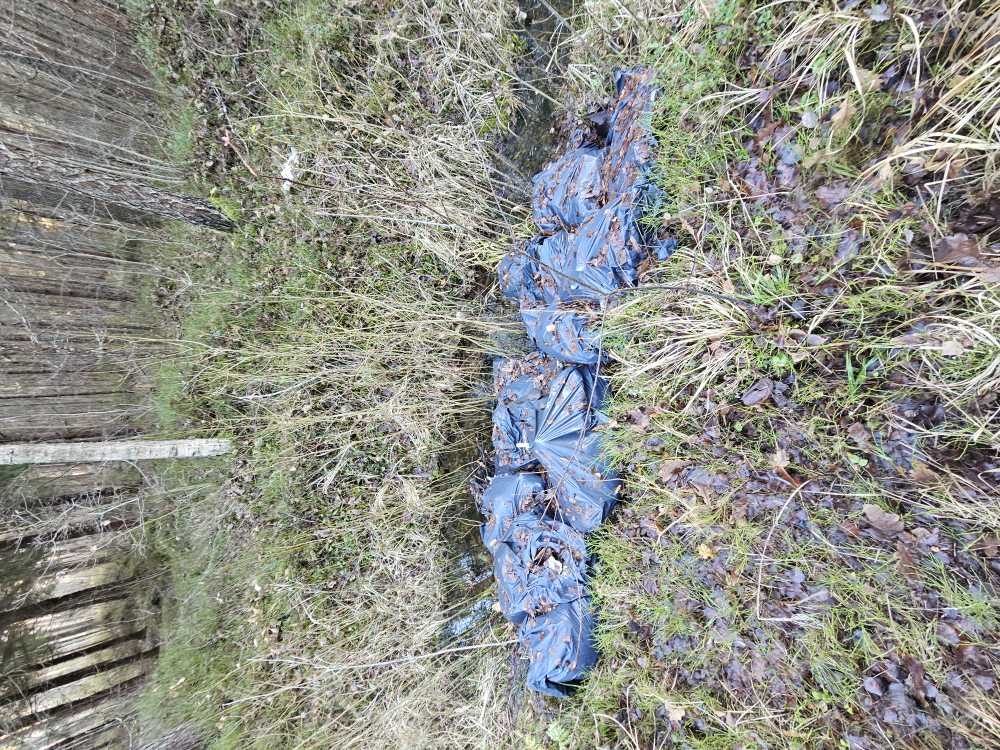 Meža grāvis piemēslots ar būvniecības atkritumiem (šīferi) un riepām