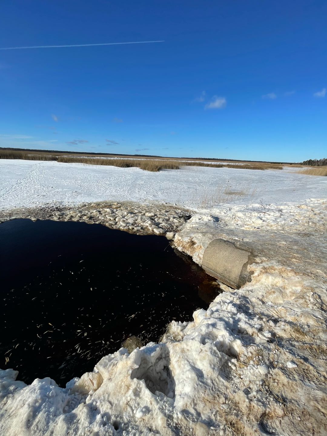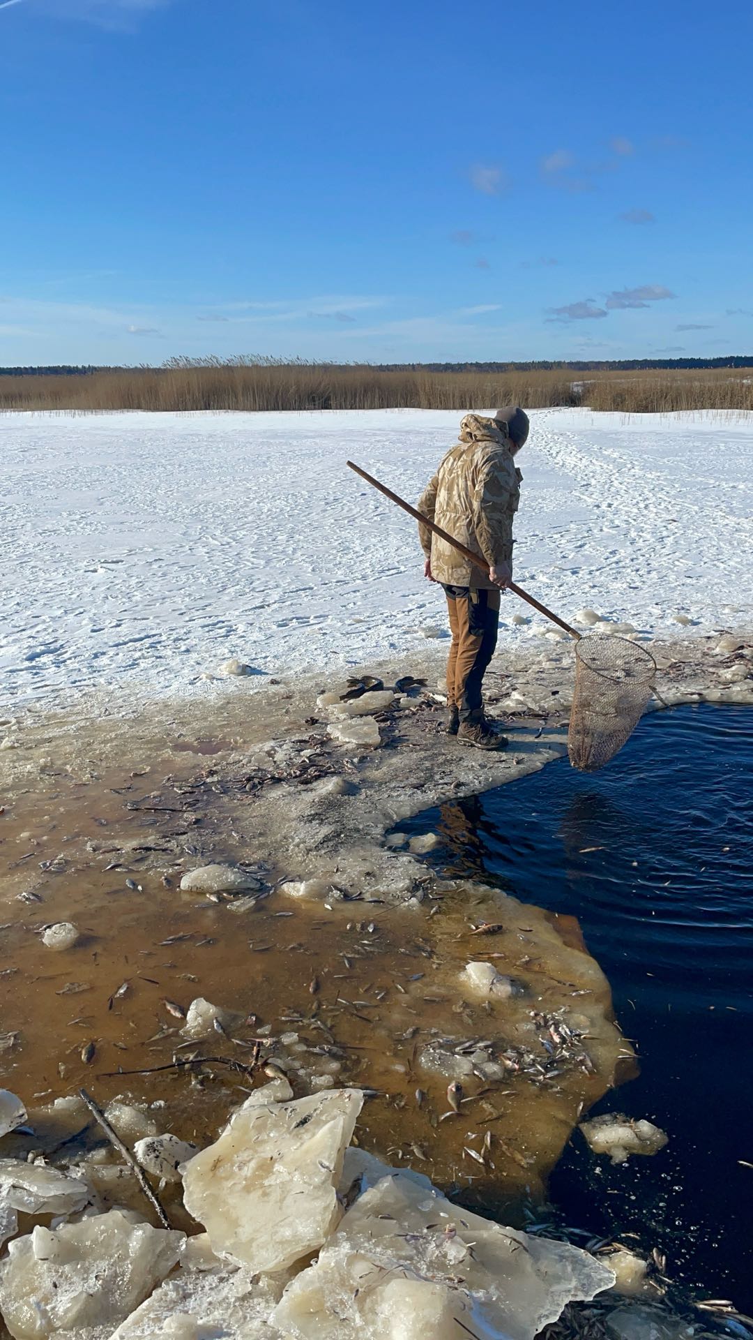 Kaņieru ezerā pie Antiņciema. Pie trubas, kas savieno ezerus cilvēki ķekselē zivis. Ezerā ir nolaists ūdens un zivis tur nāk elpot gaisu. Ar tīkliņiem izsmeļ zivis- lielās paņem, bet mazās atstāj uz ledus nomirt.