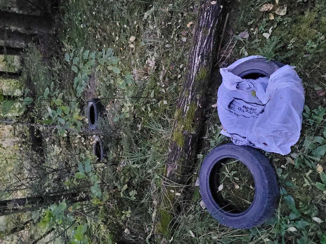Mežā, netālu no ceļa izmestas auto riepas un nenosakāmas izcelsmes atkritumi.