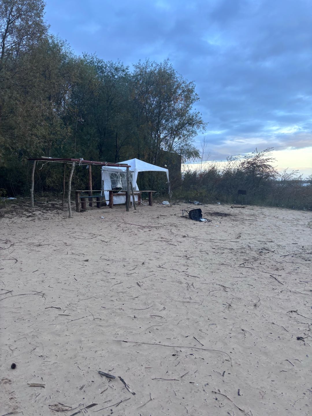 Jaunciema pludmalē netālu no ostas.Vasara beigusies un paštaisītā iedzeršanas vieta ir atstāta ar visiem vasaras laikā izmētātajiem atkritumiem-pudelēm un citiem mesliem.