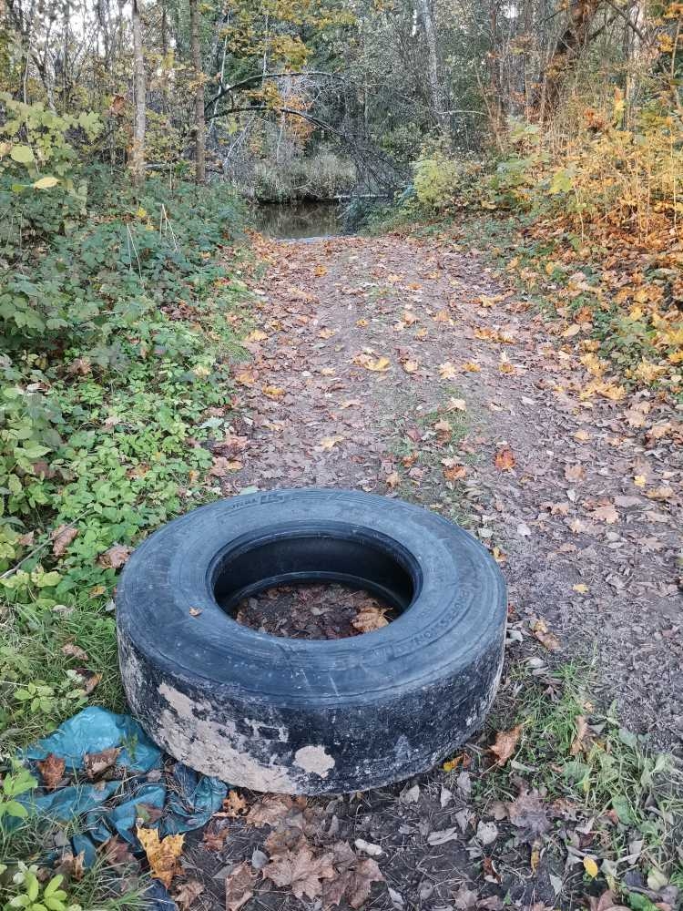 Vēl viena traktora riepa tuvāk Bērzes upei. Netālu no iepriekšējās, kas izmesta jaunaudzē.