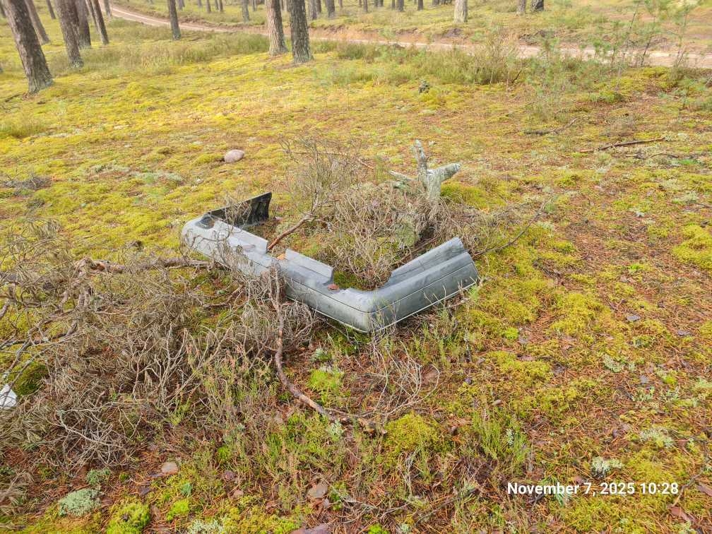 mežā izmesta automašīnas detaļa (bamperis)