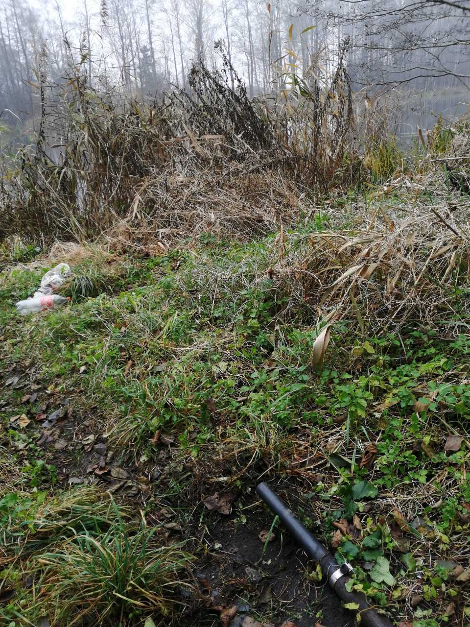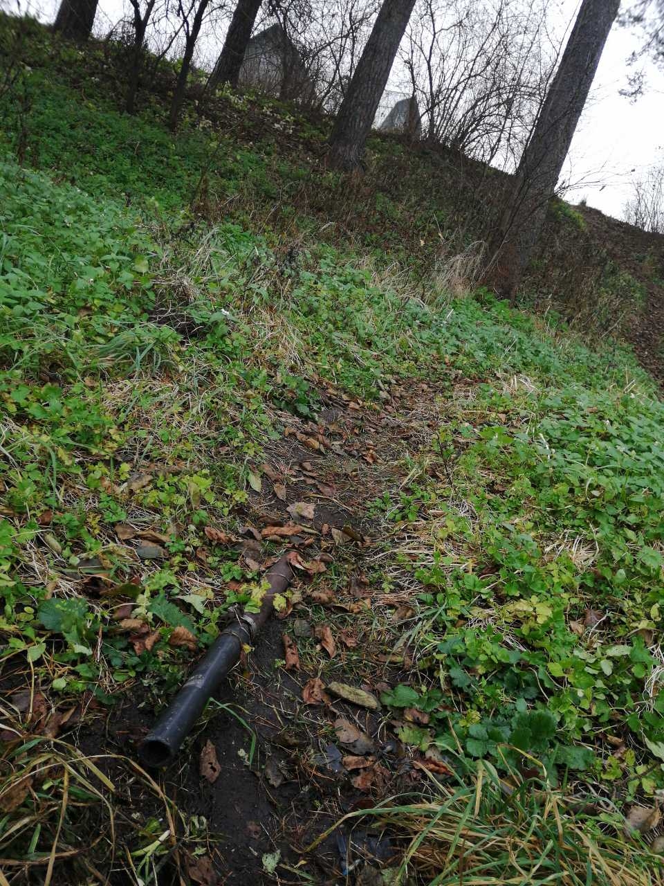 Caurule iziet no zemes. Virzienā no privātmājām uz ūdeni.