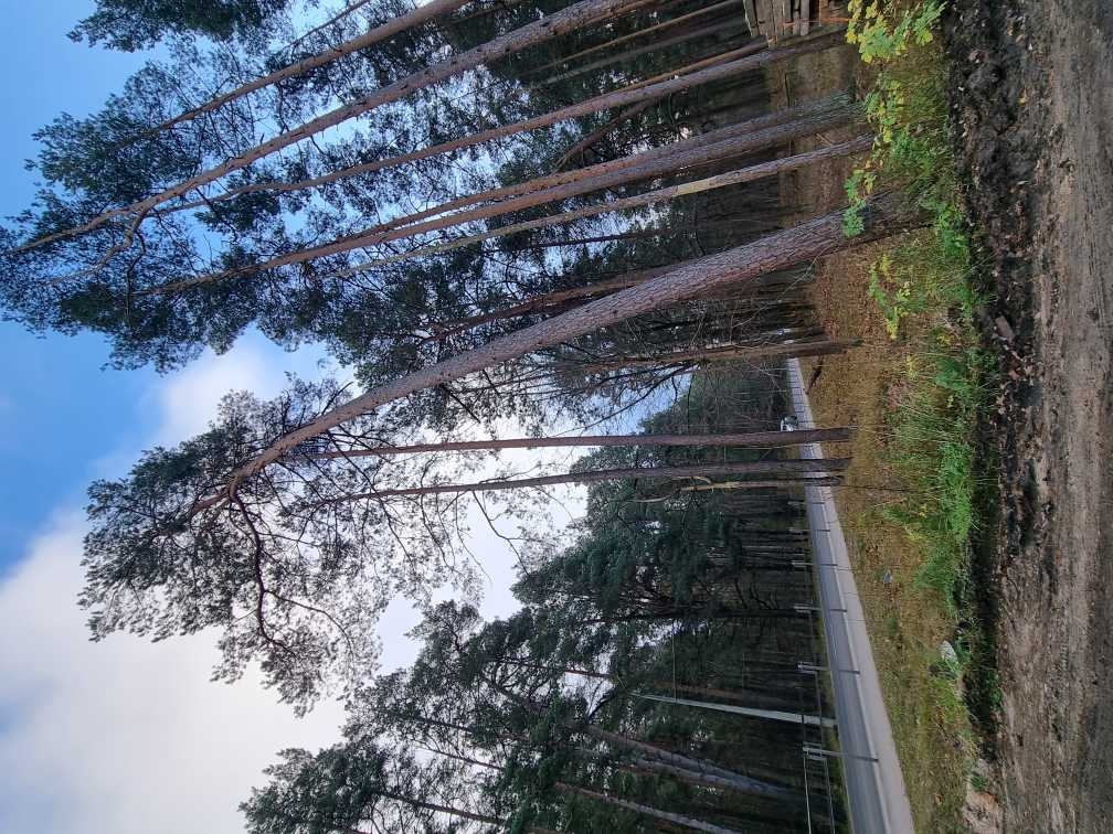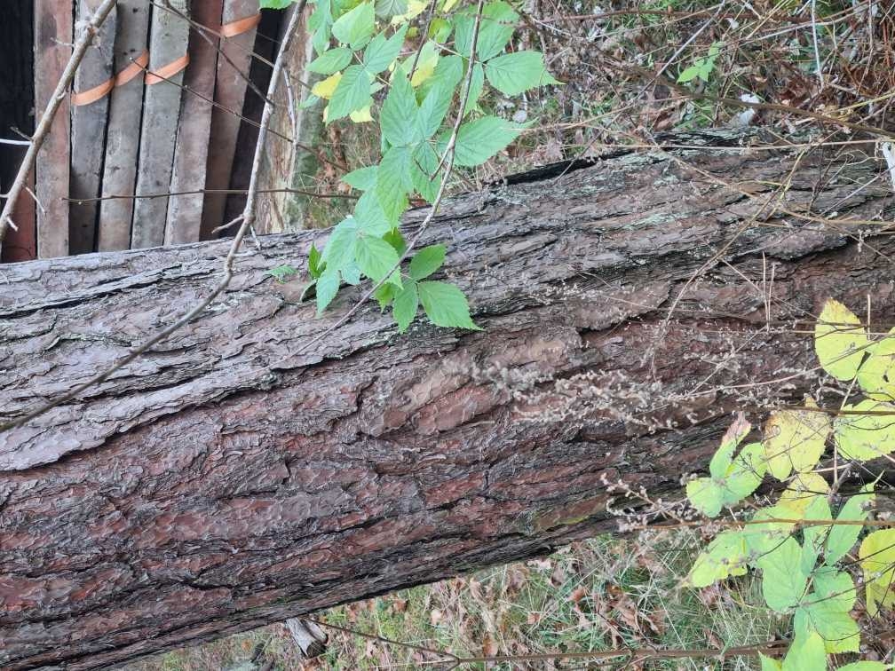 ļoti bīstama priede ieplīsusi pie pamatnes un nosveras virs braucamā ceļa, Vecāķu prospekts