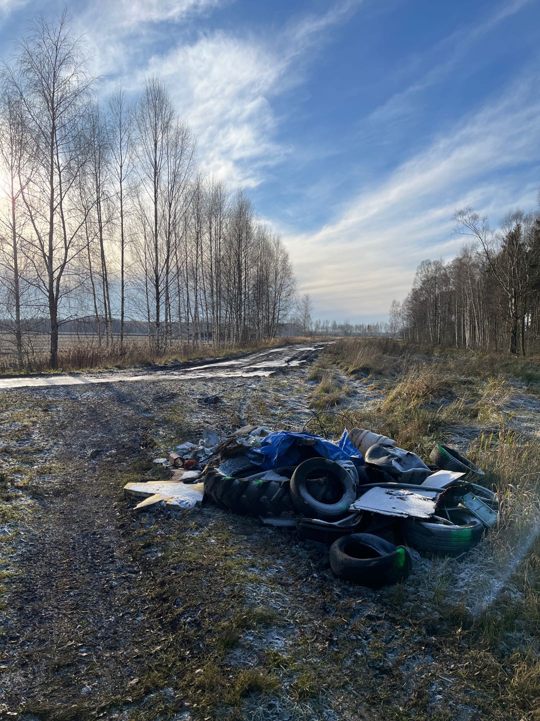 Netālu no Medema purva takas, netālu no A5 ceļa pie Neriņas izmestas riepas u.c.draza. 56.865045, 23.997753