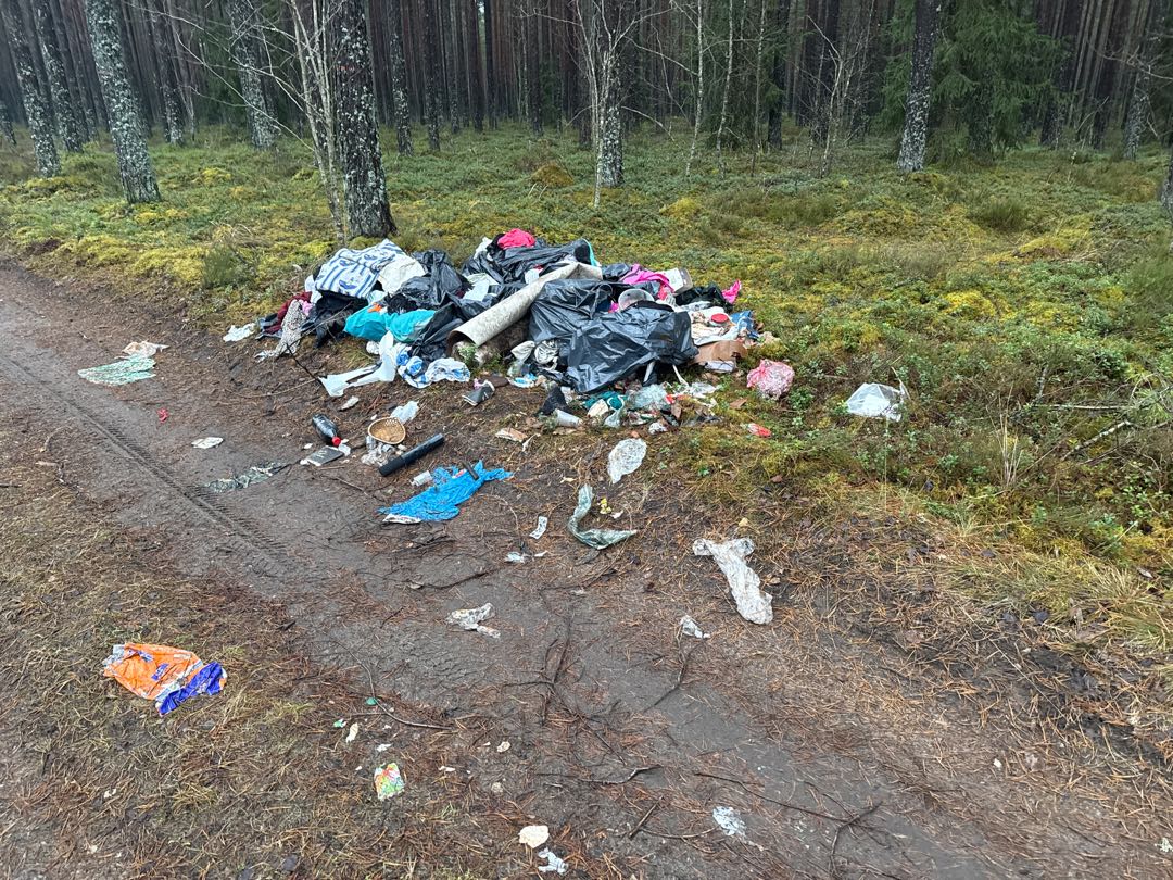Sadzīves atkritumi ~6 kvadrātmetru platībā. meža ceļš paralēli P10 šosejai