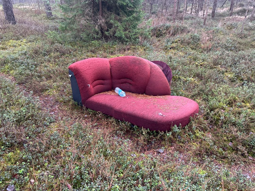 Mežā izmests dīvāns.