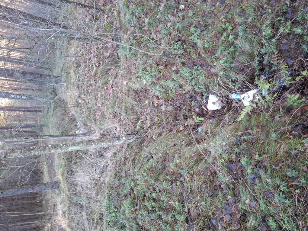 mežā izmestas plastikāta pudeles un 10 m tālāk būvgruži.