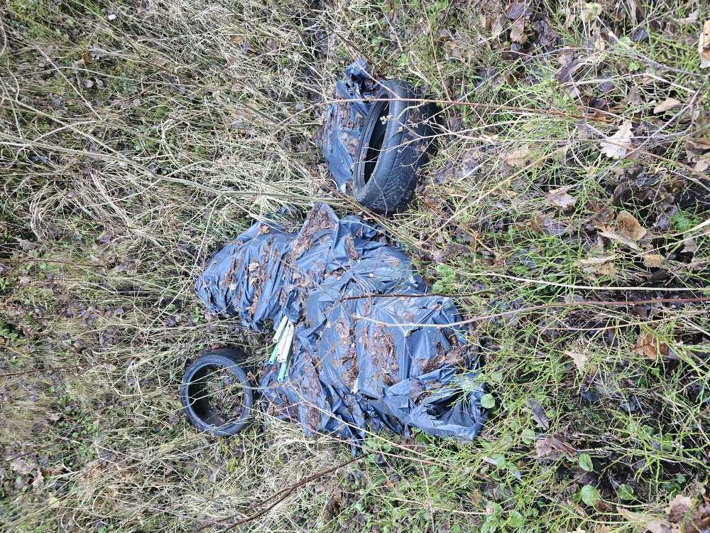 Meža grāvis piemēslots ar būvniecības atkritumiem (šīferi) un riepām