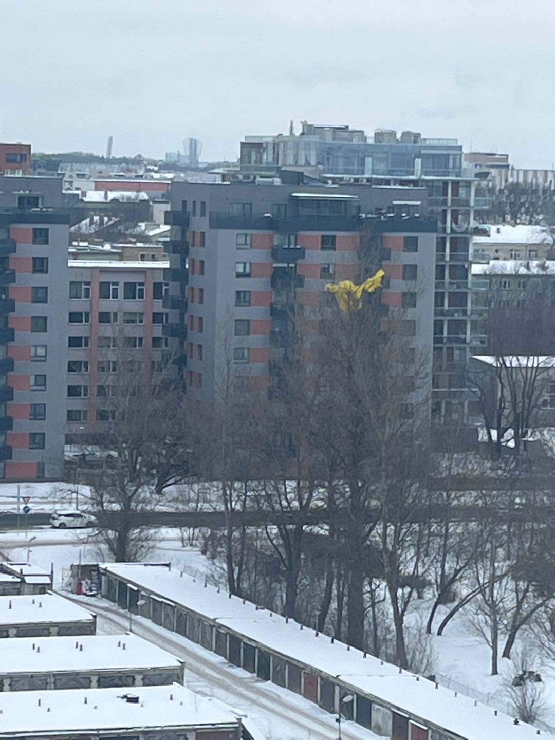 Kokos pie Skanstes skvēra (Grostonas iela 16) jau kopš decembra ir ieķērusies dzeltena, liela plēve.