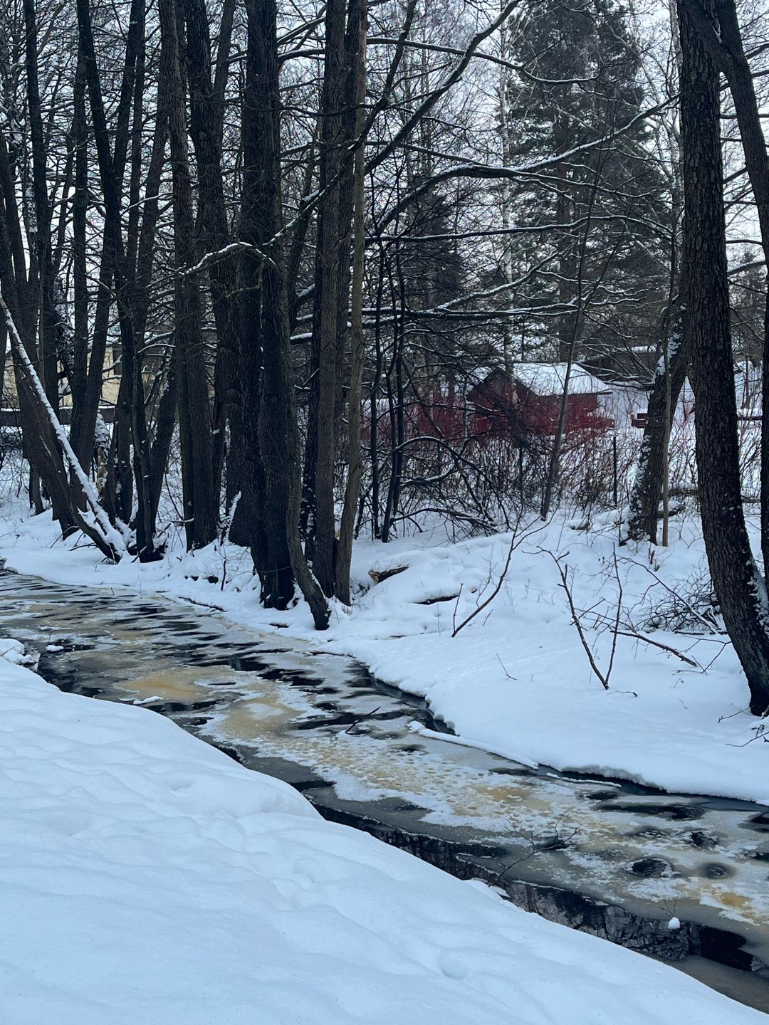 Mārupīte Bieriņos, Rīgā, vēl vakar vai aizvakar bija aizsalusi. Šodien vaļā un dzeltena. Foto pie Codes un Dauguļu ielām. Augstāk, pie Posma un Kravas ielām, liekas, ka nav problēma.