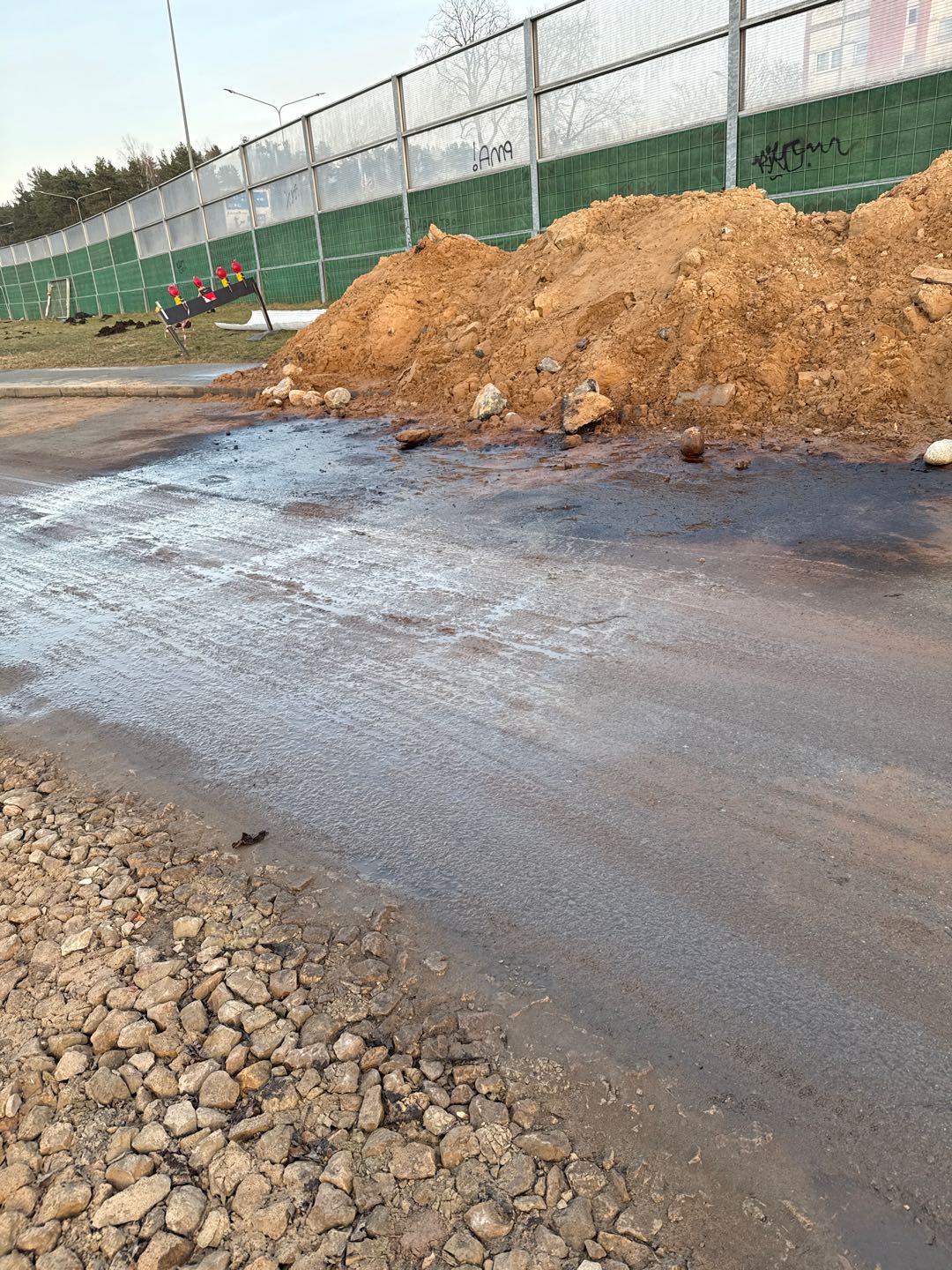 Gulbju iela pie 12 numurā ir eļļas vai degvielas peļķe, darbinieki prom