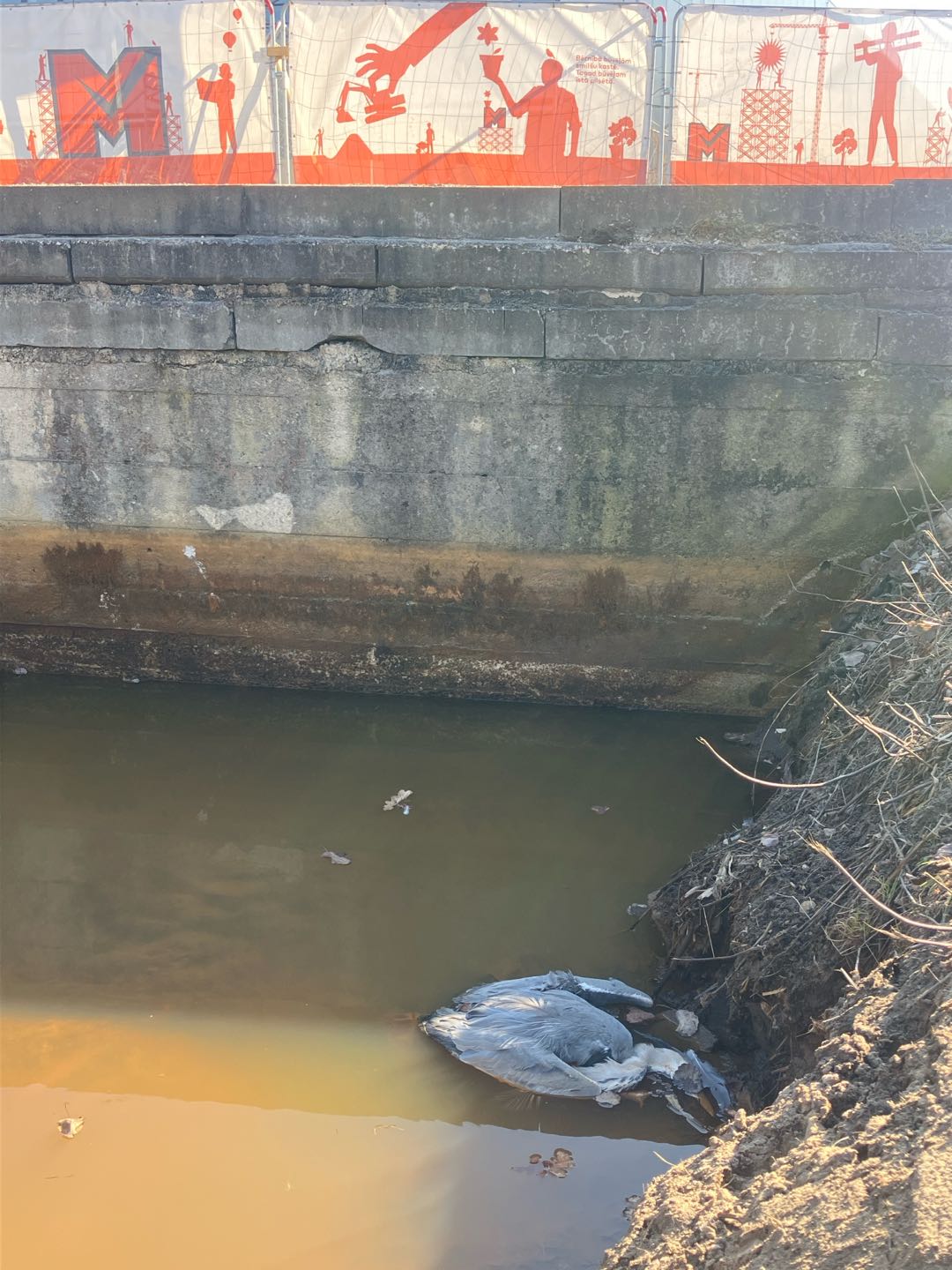 Miruši savvaļas putni - grāvī starp Grenču ielu 1 un 1a, Rīgā, LV1029, grāvī miruši gārnis un mežapīle. Mežapīles ķermenis no rīta bija prom, bet gārnis joprojām ir ūdenī.